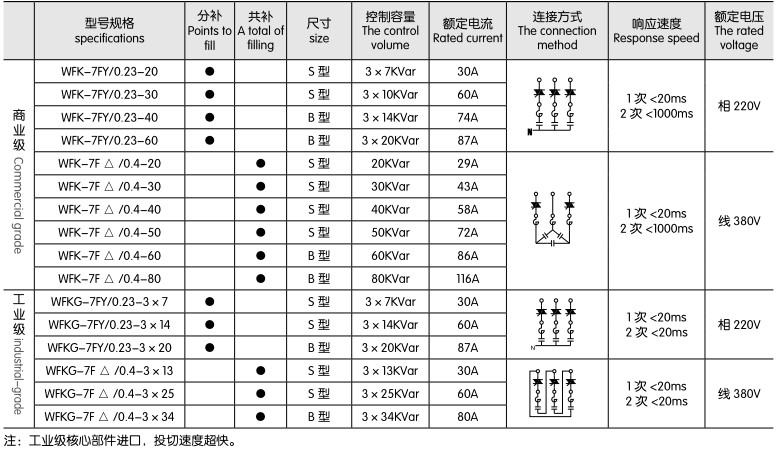 WFK 系列动态调节器(俗称容性无触点开关),是一种能对电力电容器做快速投切的功率器件。投切过程无勇流 , 无需放电可频繁投切 , 无投切次数的限制,并自带温度管理系统及过热保护功能。